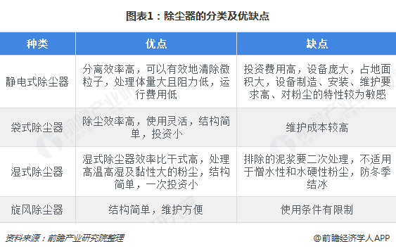 根据工作原理分类,除尘器可分为静电式除尘器、袋式除尘器、湿式除尘器及旋风除尘器等。其中,静电式除尘器除尘效率高、运行费用较低,但设备庞大、占地面积大,设备制造、安装、维护要求高、对粉尘的特性较为敏感;袋式除尘器除尘效率也高,使用灵活,结构简单,投资小,但维护成本较高;湿式除尘器效率比干式高,处理高温高湿及黏性大的粉尘,结构简单,一次投资小,但不适用于憎水性和水硬性粉尘,防冬季结冰;旋风除尘器结构简单,维护方便。