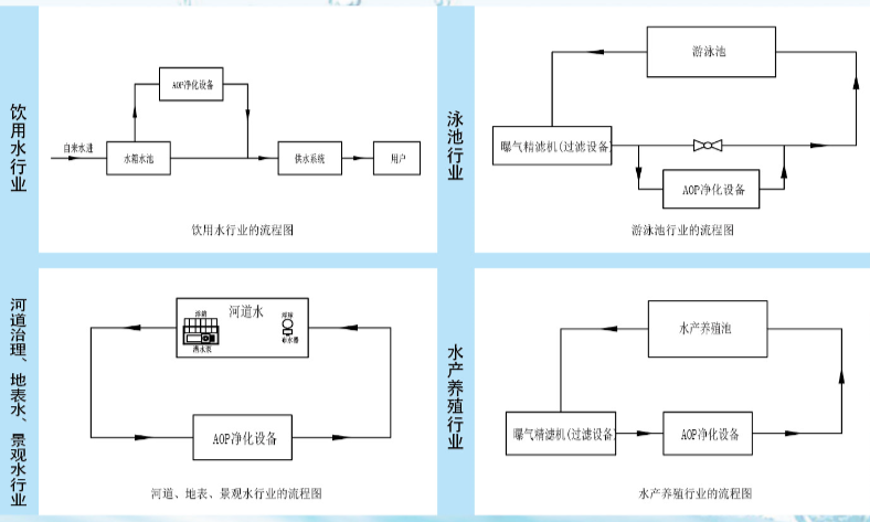 二、AOP高级氧化产品应用行业冠宇AOP水体净化设备采用UV光催化+臭氧+高级氧化技术,产品可以应用于二次供水、河道治理、黑臭水体、游泳池、地表水、景观水、水产养殖等水处理系统。