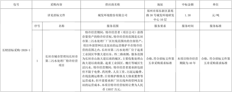 长垣市城市管理局长垣市第二污水处理厂特许经营项目中标公告