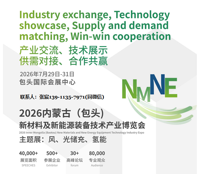 为推动产业链上下游 对接,促进技术转化与项目落地,经研究,同意由内蒙古贸宸国际会议展览有限公司承办的“2026内蒙古(包头)新材料及新能源装备技术产业博览会”,定于2026年7月29-31日在包头国际会展中心举行,专注能源行业国际性、专业化的展会平台,汇聚众多涵盖光伏技术与设备、储能技术与设备、氢能技术与设备、风电技术与装备、燃料电池系统及成果应用、关键零部件、燃料电池汽车等具有影响力的参展商,完整展示绿色能源产业链,打造深度的技术交流平台,通过行业趋势解读、政策导向与技术分享,充分挖掘行业发展新需求,共同开拓市场新机遇。
