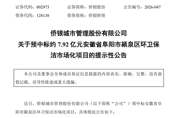 侨银城市管理股份有限公司(简称:侨银股份)近日公告称,公司预中标安徽省阜阳市颍泉区环卫保洁市场化项目,中标金额66,030,000元/年。