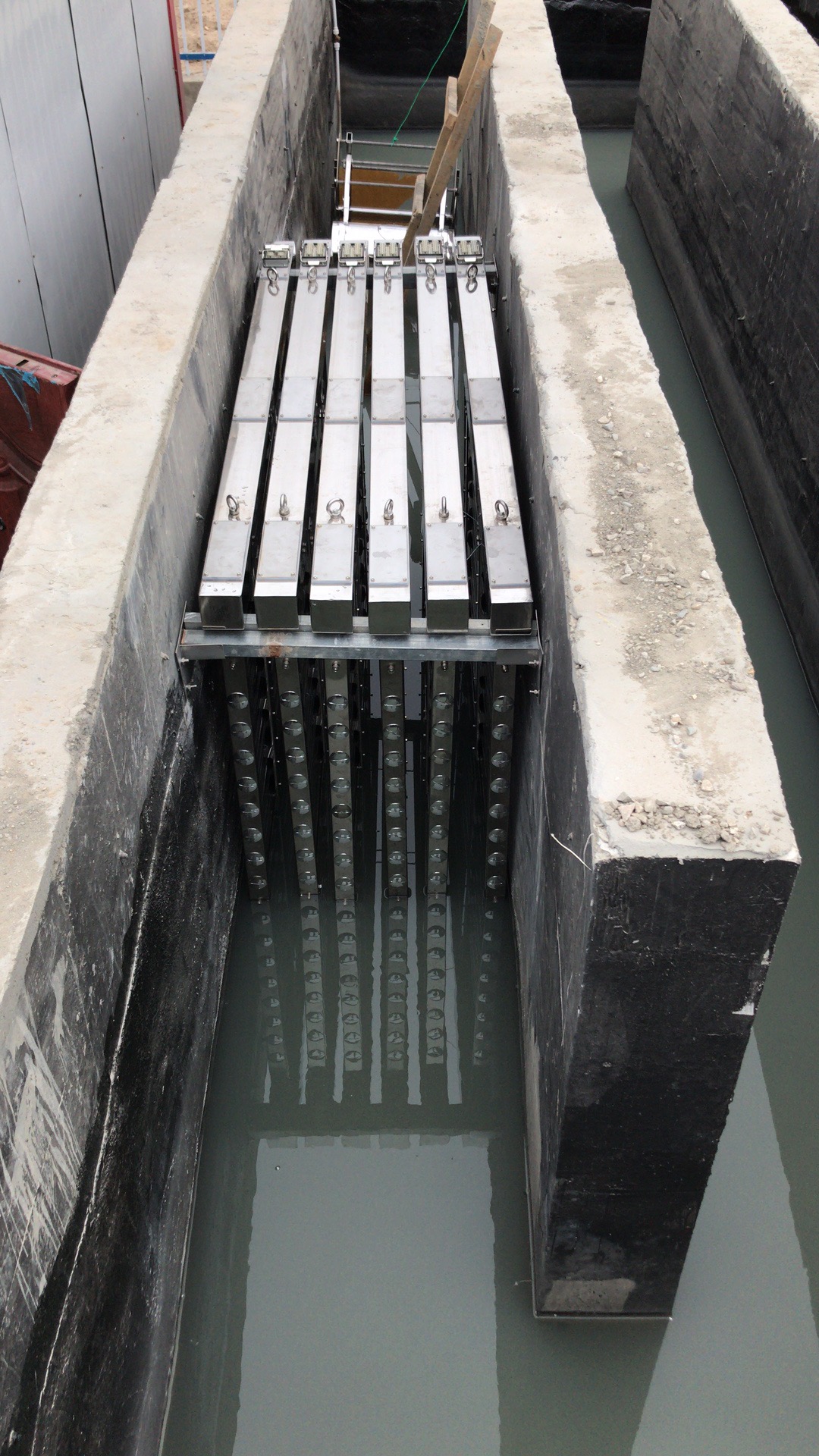 该设计优点:渠所用材质均为耐腐蚀的316L、304不锈钢,整个系统中灯管插座、供电插座及紫外灯电线均封闭在紫外灯渠组件内,不会暴露于污水和紫外光水中。整个渠支架为316、304不锈钢制造并安装在明渠的污水上方,每个渠单独设置,并无需紧固地悬挂在明渠内污水的上方,因此在更换灯管或石英套管时,每个渠能单独被吊起且不影响其他渠。