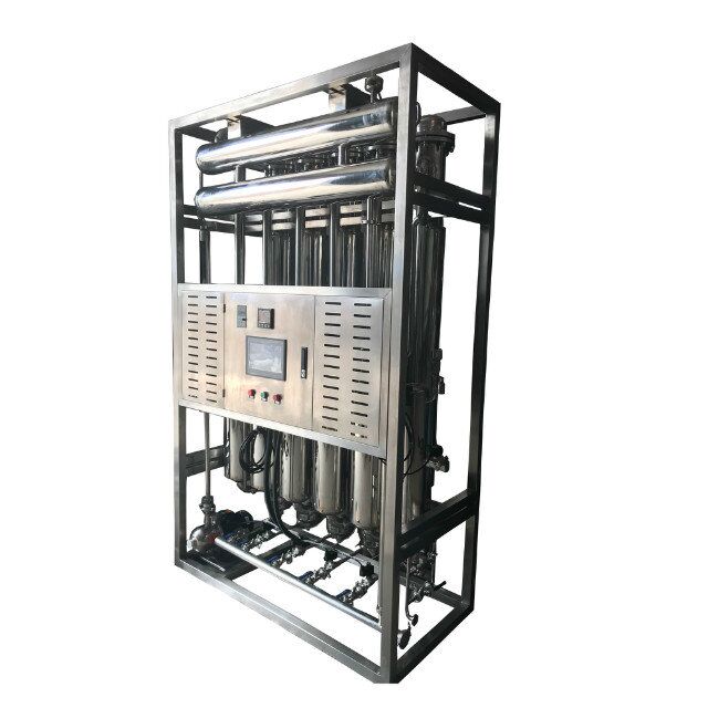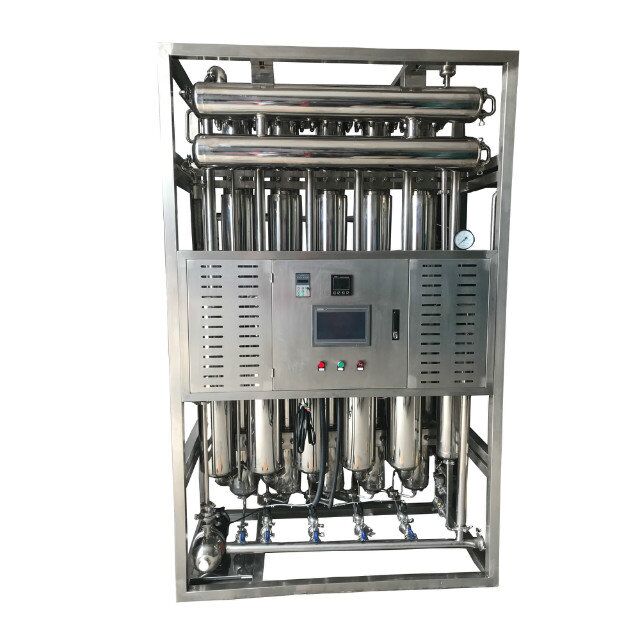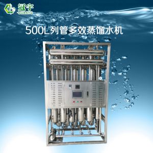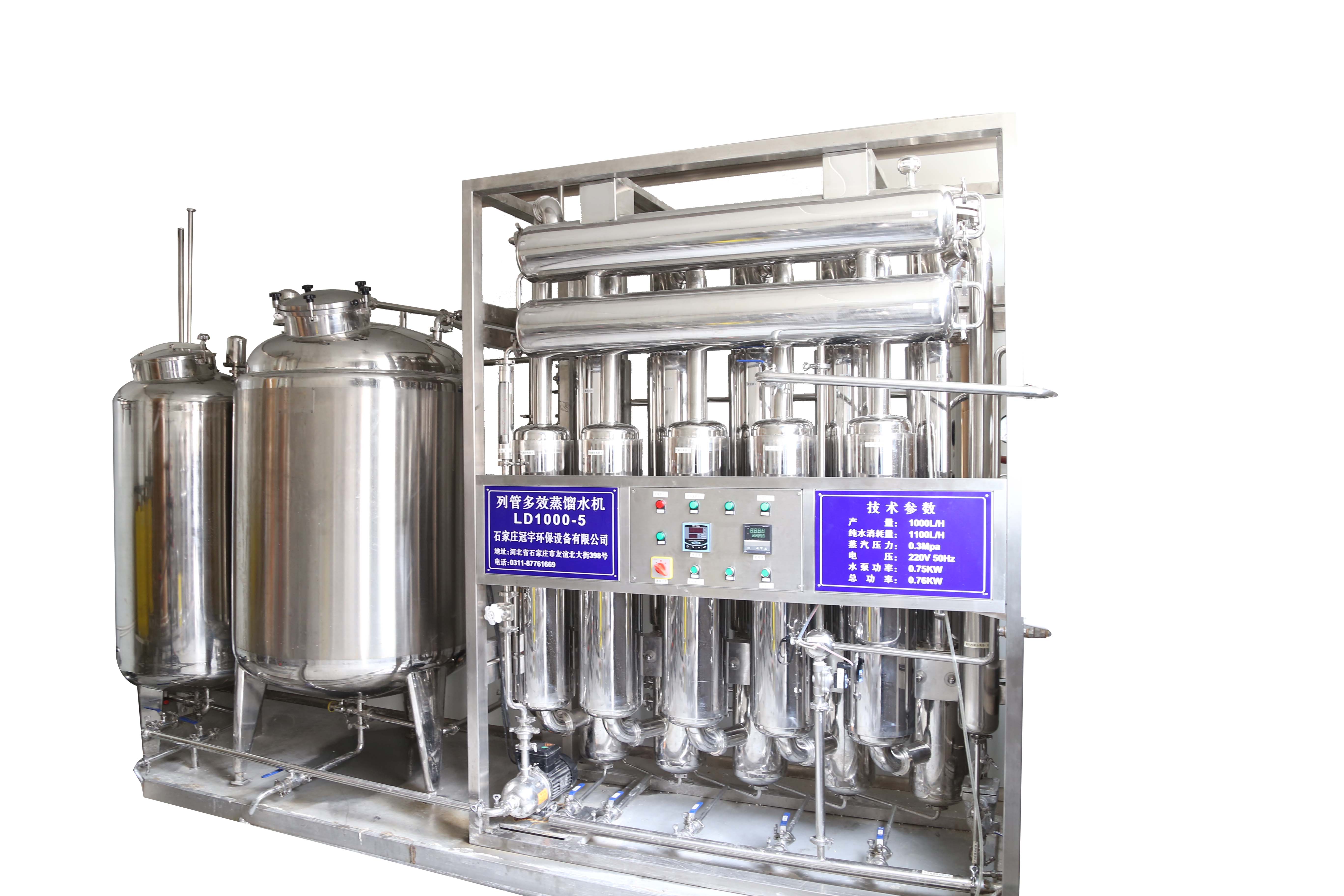 列管五效蒸馏水机新型列管五效蒸馏水机是我公司科研人员在大连理工大学林教授指导下结合国内外先进蒸馏机械开发研制的新型制取蒸馏水设备。由于它造型美观,结构合理,节汽省水,操作简便,深受用户赞誉。广泛应用于医院,药厂,化工科研单位,制取蒸馏水。本蒸馏水机用于生产注射用蒸馏水,其水质符合中华人民共和国药典有关注射用蒸馏水的各项规定。该设备为我公司自主生产,外形大气美观,为304或316全不锈钢制作,涉水部位为316L不锈钢材质,并且不用添加额外冷却水,每年为客户省水在10吨以上,设计合理,蒸馏水出水电导率能达到双零(即小于0.1),大大超过 0.2的合格蒸馏水标准