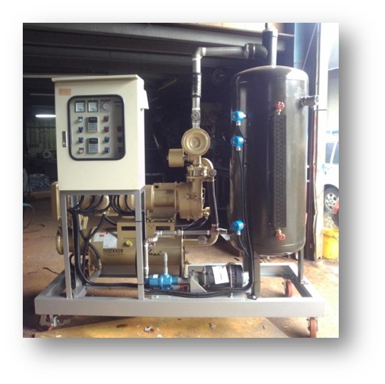 本套土壤气体抽除设备系属液环式抽气设备,适合应用于原位污染修复技术之单帮浦双相抽除处理法(DPE)。该修复技术中,主要利用本设备真空抽气能力造成未饱和层趋向真空,并因抽取汲井附近抽气作用,使污染区外干净土壤气体引入形成通气现象,使污染区土壤层供氧,产生类似生物通气作用,使未饱和层土壤形成生物降解作用。另因抽气使抽汲井内形成负压,使地下水水位扬升而被抽出,如有效规画抽汲井数量、位置及地下水抽取量之控制,亦可达到水力控制限制浮油团的扩散。