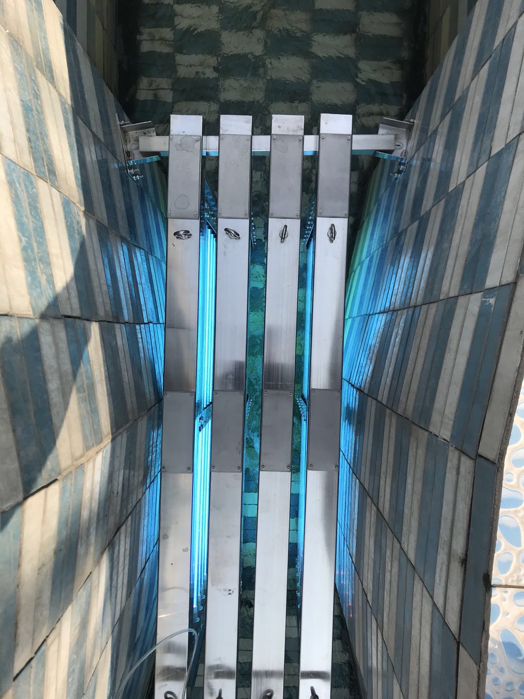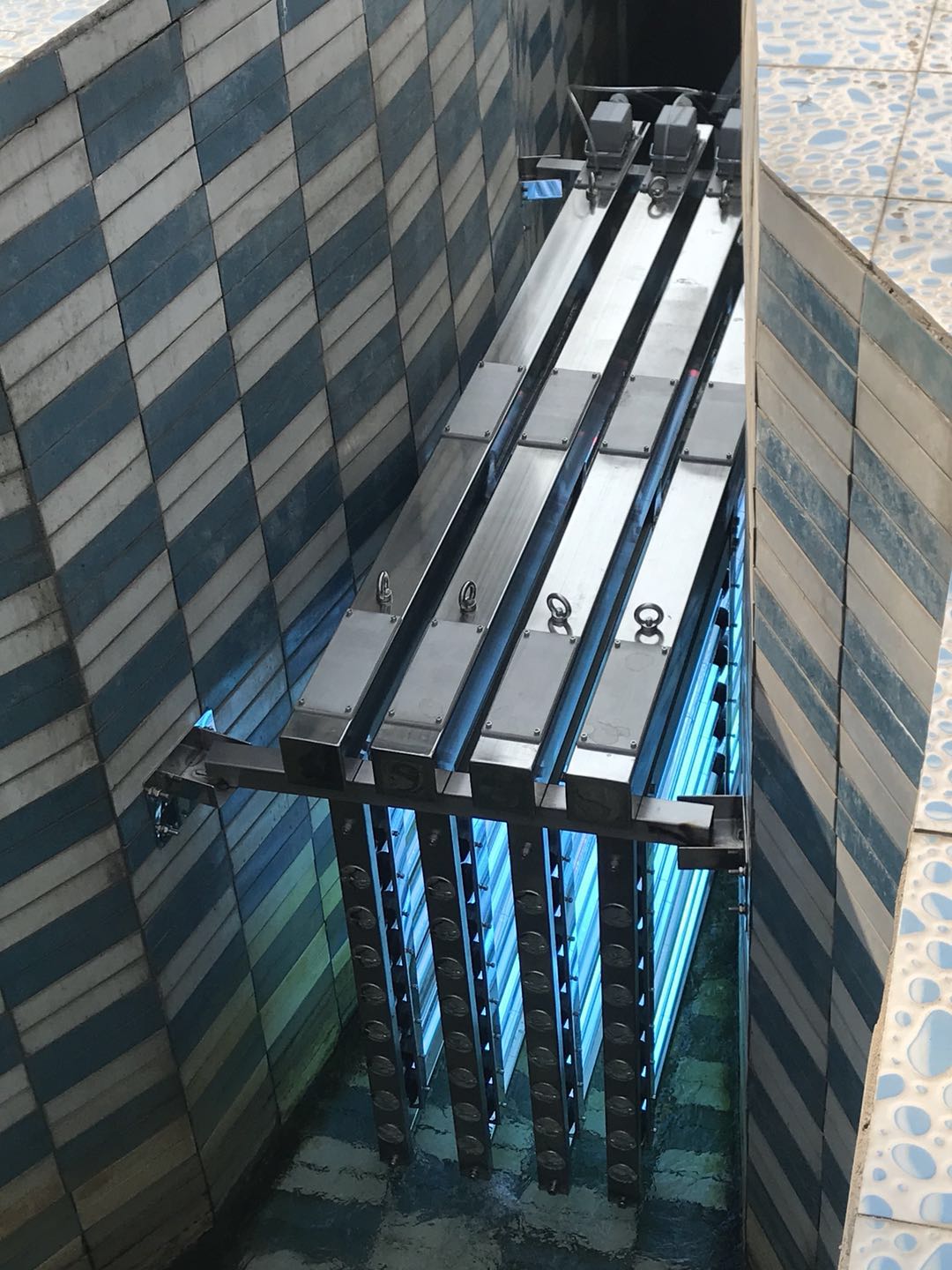 1.紫外线设备采用双排灯19932888950并列排布,防水设计,模块上端镇流器盒防护等级达到IP54;单个模块结构紧凑、安装方便,在水流动过程中可实现单独维护