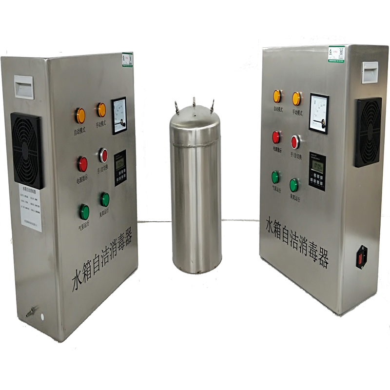 WTS水箱自洁消毒器通过高频高压电场,使氧转化为臭氧,并及时与水混合,利用臭氧的强氧化作用,杀灭水中的细菌。杀灭细菌效果较好的浓度,可以通过改变进压力、气量、电流等调节来达到。由于臭氧在水中的氧化还原电位为 2.07v,比氯(1.36v)高,所以在臭氧量仅为氯的万分之一时,灭菌效果比氯及其它药剂快600-3000 倍,数秒内可杀死细菌。