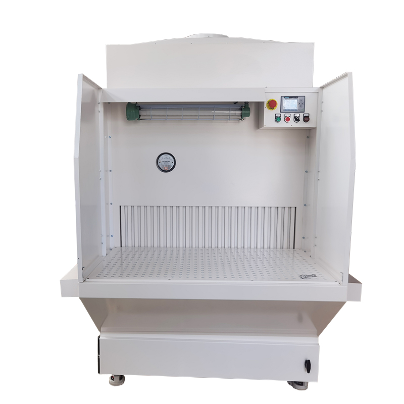 济南美蓝环保生产的打磨除尘工作台采用三面包围式设计,对粉尘进行有效控制,工作台面为吸尘口,可在粉尘产生源头直接进行高效收集,及时阻止粉尘的扩散,粉尘通过精度高达0.3μm的高效阻燃滤芯过滤净化后,干净的空气直接排放在室内,保持车间空气清洁。被过滤后掉的粉尘收集在集尘抽屉内,防止二次污染,同时对贵重金属物料起到回收作用。