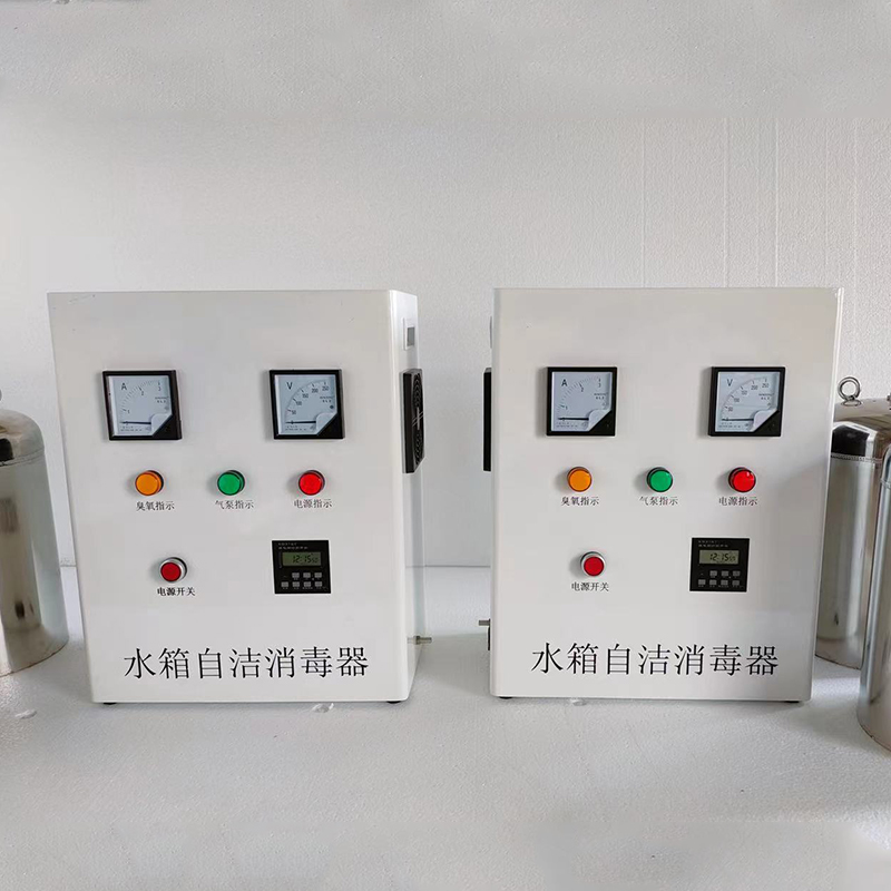 水箱自洁消毒器分为内置式和外置式,(常用型号有WTS-2A ,WTS-2B,WTS-2W。SCII-5HB,SCII-10HB,SCII-20HB,ZM-2,ZM-1。)内置式也叫分体式,是有控制柜和辅机组成。控制柜安装于水箱外面产生臭氧,辅机安装于水箱内部起到将臭氧与水混合作用