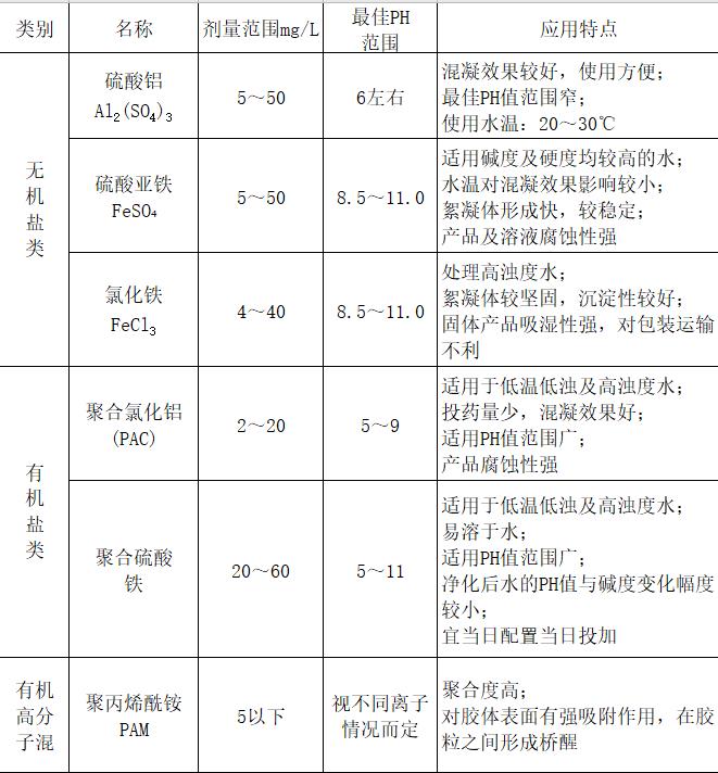 污水治理中常用的混凝剂大致可以分为三类:有机混凝剂、无机混凝剂和高分子混凝剂。有机混凝剂有阴阳离子型之分;无机混凝剂有无机类、碱类、固体细粉类等区别;高分子混凝剂根据聚合度的不同可分为高聚合度混凝剂和低聚合度混凝剂,不同聚合度下又有阳离子型、阴离子型和非离子型,高分子混凝剂也有有机与无机类之分。选用混凝剂的品种、数量应根据处理对象,即不同的废水的试验资料和条件而定,必须从价廉、易得、投用量少、处理效率高且生成的絮状物容易沉淀分离等方面考虑。当投加单个混凝剂处理效果不理想时,还可以投加助凝剂或者可以考虑两种混凝剂按比例混合投加。
