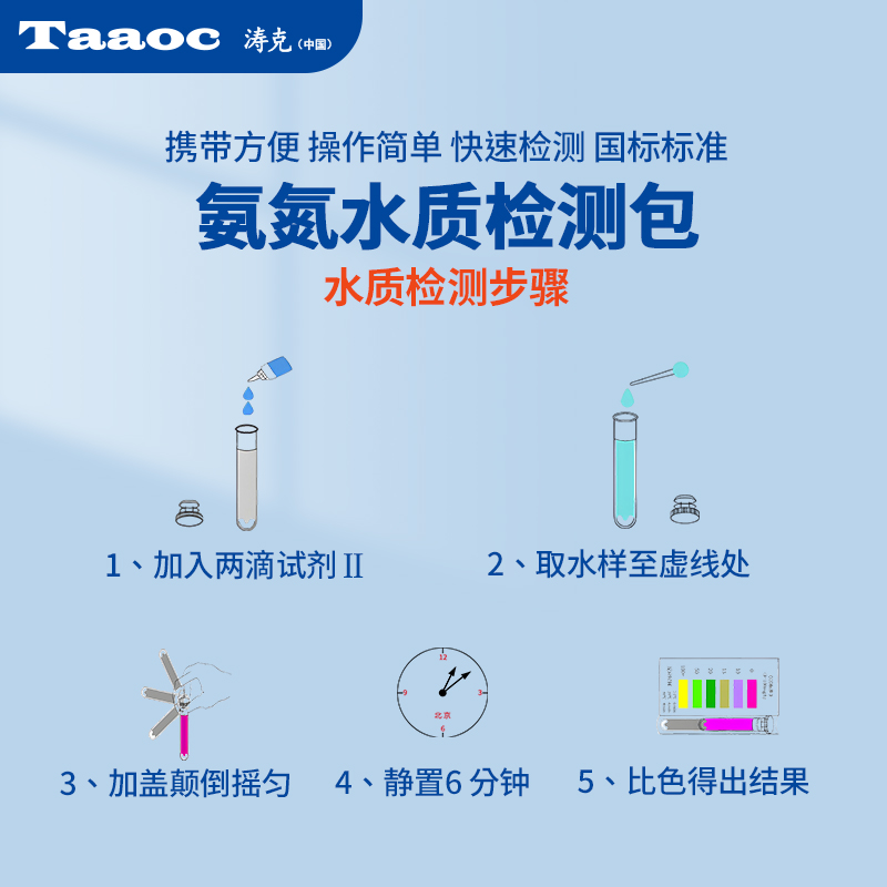 涛克 水质快速检测包氨氮测试包氨氮快速测试包0-10mg/l可快速测定水中的氨氮含量,小巧、便捷,便于携带,无论您是在生产现场进行快速测定,还是在户外进行快速排查,测试包均能满足您的水质检测使用需求。测试包集成了水质分析领域成熟技术,整个操作流程简单、快速,检测结果稳定可靠。