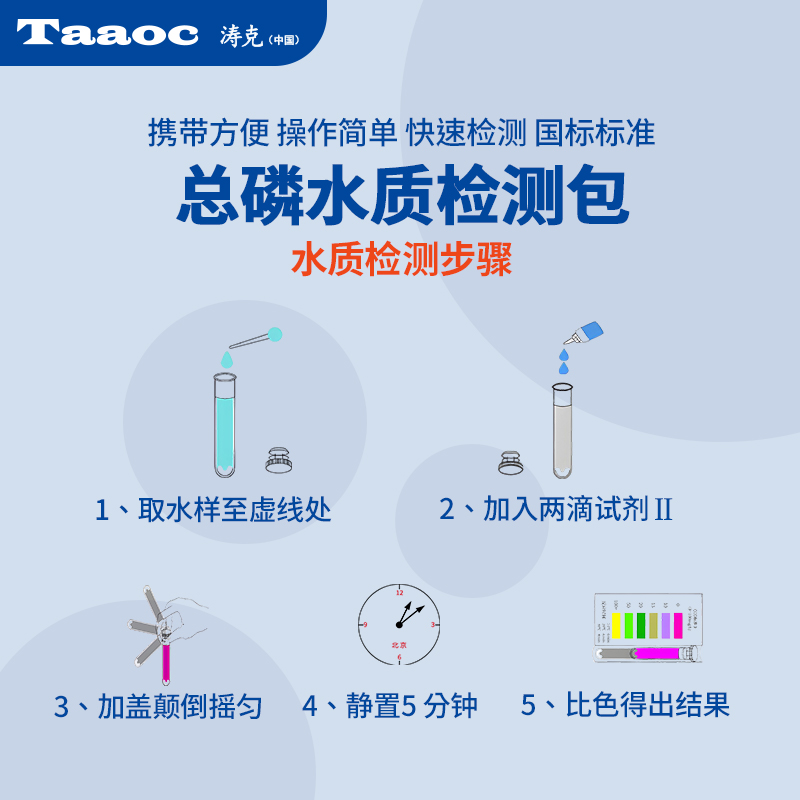 涛克 水质快速检测包总磷测试包总磷快速测试包0-5mg/l可快速测定水中的总磷含量,小巧、便捷,便于携带,无论您是在生产现场进行快速测定,还是在户外进行快速排查,测试包均能满足您的水质检测使用需求。测试包集成了水质分析领域成熟技术,整个操作流程简单、快速,检测结果稳定可靠。