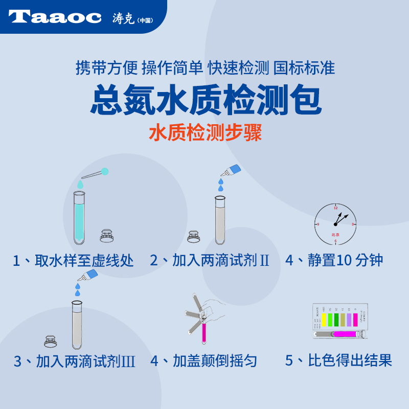 涛克 水质快速检测包总氮测试包总氮快速测试包0-20mg/l可快速测定水中的总氮含量,小巧、便捷,便于携带,无论您是在生产现场进行快速测定,还是在户外进行快速排查,测试包均能满足您的水质检测使用需求。测试包集成了水质分析领域成熟技术,整个操作流程简单、快速,检测结果稳定可靠。