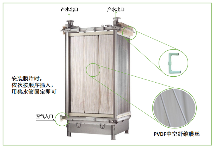 4.膜表面抗污染性能高........膜复合结构为2层PVDF膜与1层加强筋,耐磨擦。