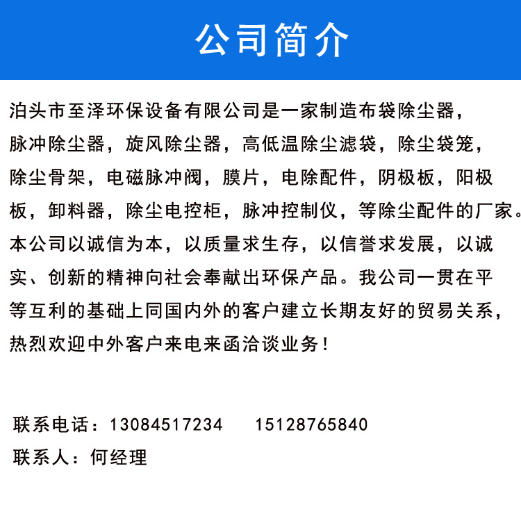 泊头市至泽环保设备有限公司是一家专业制造布袋除尘器,脉冲除尘器,旋风除尘器,高低温除尘滤袋,除尘袋笼,除尘骨架,电磁脉冲阀,膜片,电除配件,阴极板,阳极板,卸料器,除尘电控柜,脉冲控制仪,等除尘配件的专业厂家。