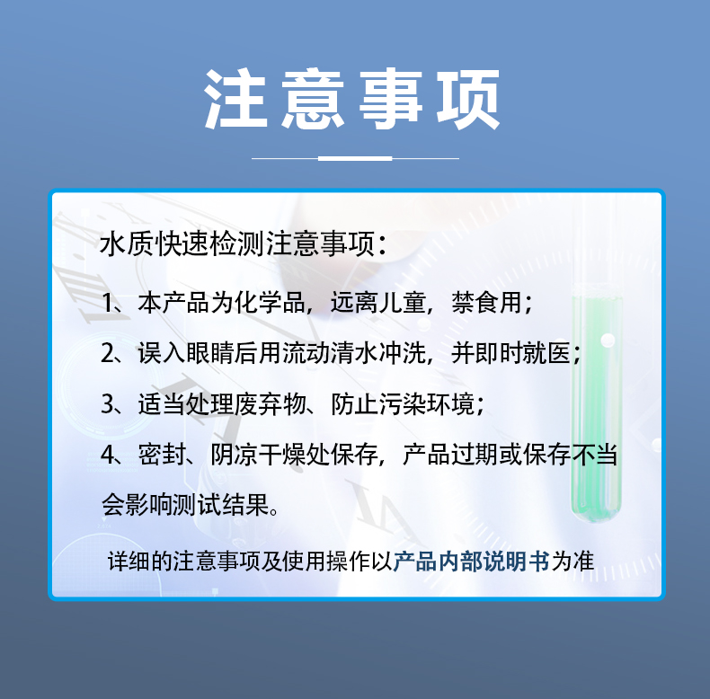 1、本产品使用少量化学药品,使用前请认真阅读说明书;