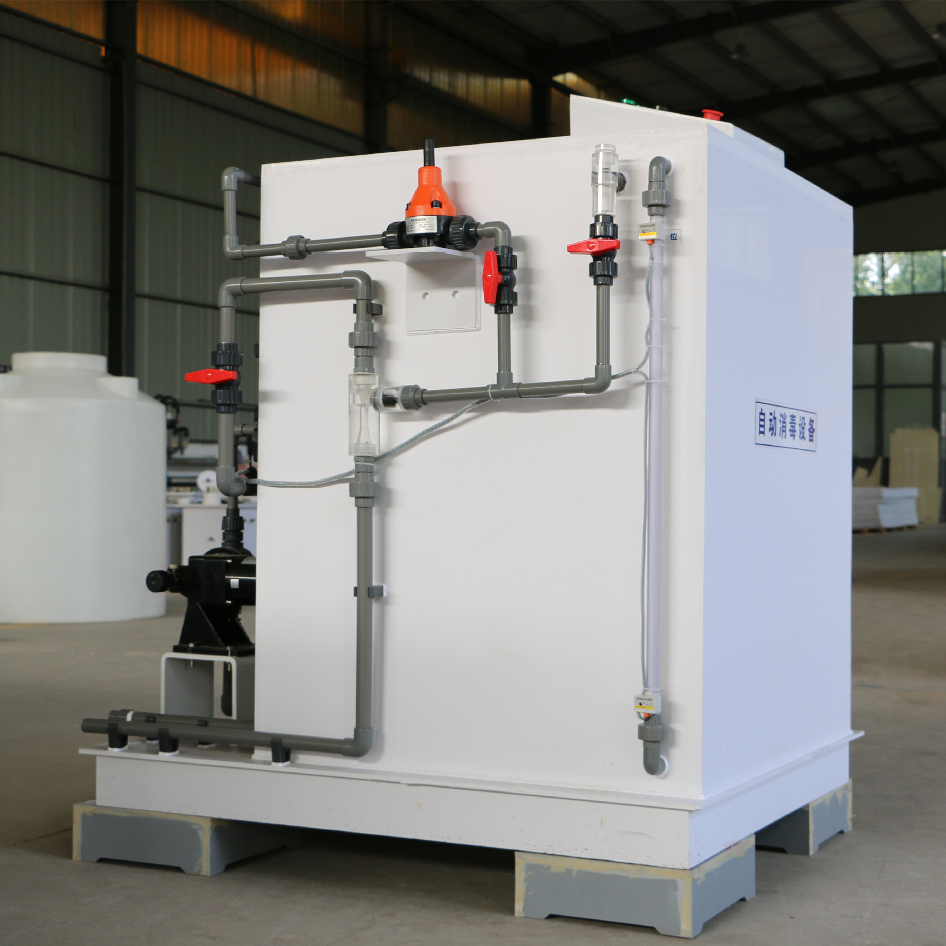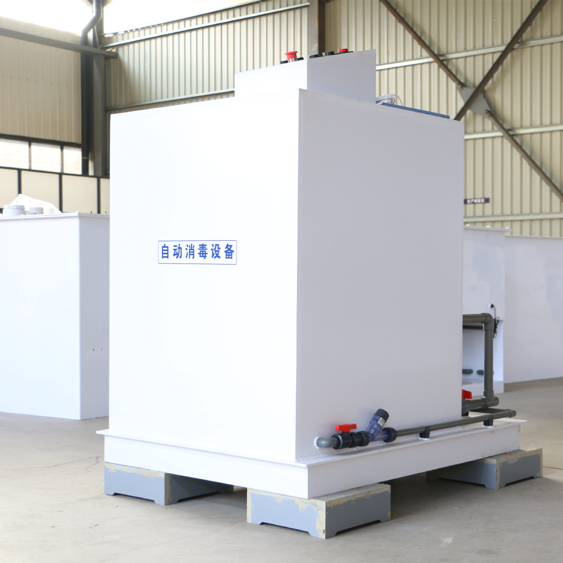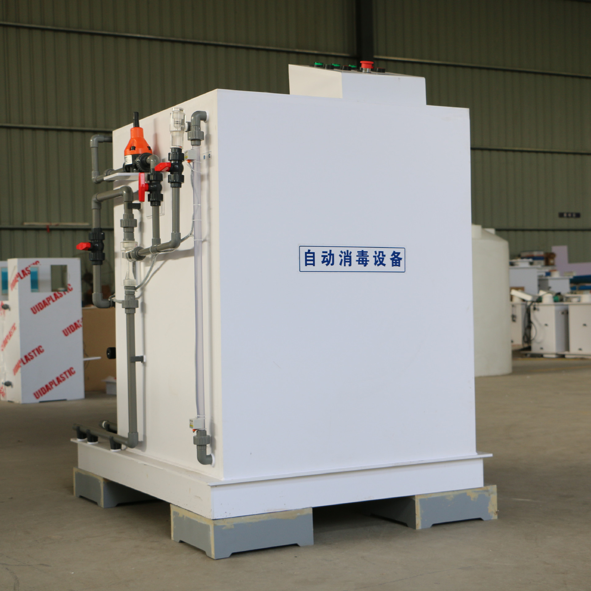 本公司生产活性氧消毒剂投加装置,采用防腐加厚PVC材料制作,微电脑全自动控制,自动上水,自动搅拌,自动投加。产品由化料系统、投加系统、低液位报警系统、定时系统等组成。