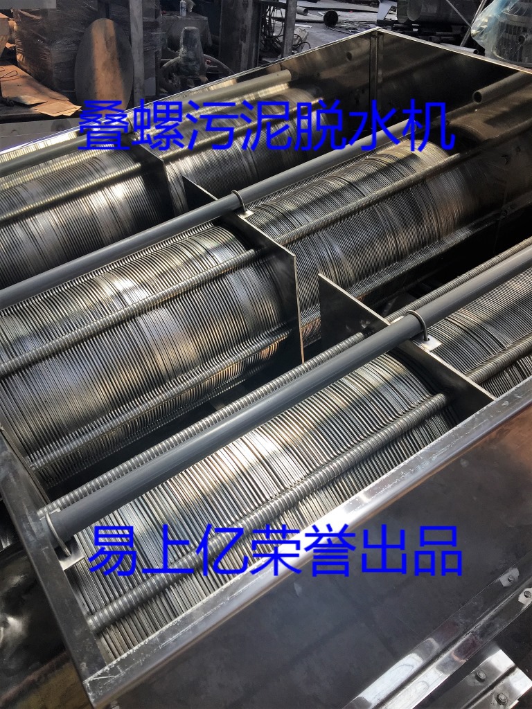 (脱水部分)脱水机的叠螺主体是由固定环和游动环相互层叠,螺旋轴贯穿其中形成的过滤装置,集浓缩和脱水为一体,前段为浓缩部,后段为脱水部。每个游动环都镶嵌在两个固定环中间,之间形成的滤缝以及螺旋轴的螺距从浓缩部到脱水部逐渐变小。固定环、游动环的内径和螺旋轴的螺旋直径一样,保证了运行中几乎没有磨损;脱水部的终端有一个背压板产生内压。