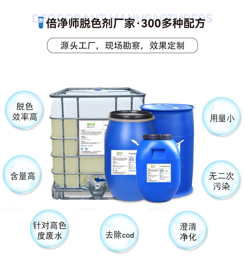 倍净师® 高效脱色絮凝剂是本公司自主研发生产,集脱色、絮凝、降 COD、BOD 等多种功能一体的有机高分子复配聚合物,属于絮凝脱色水处理剂,污水脱色絮凝剂应用范围广泛,不影响生化系统。