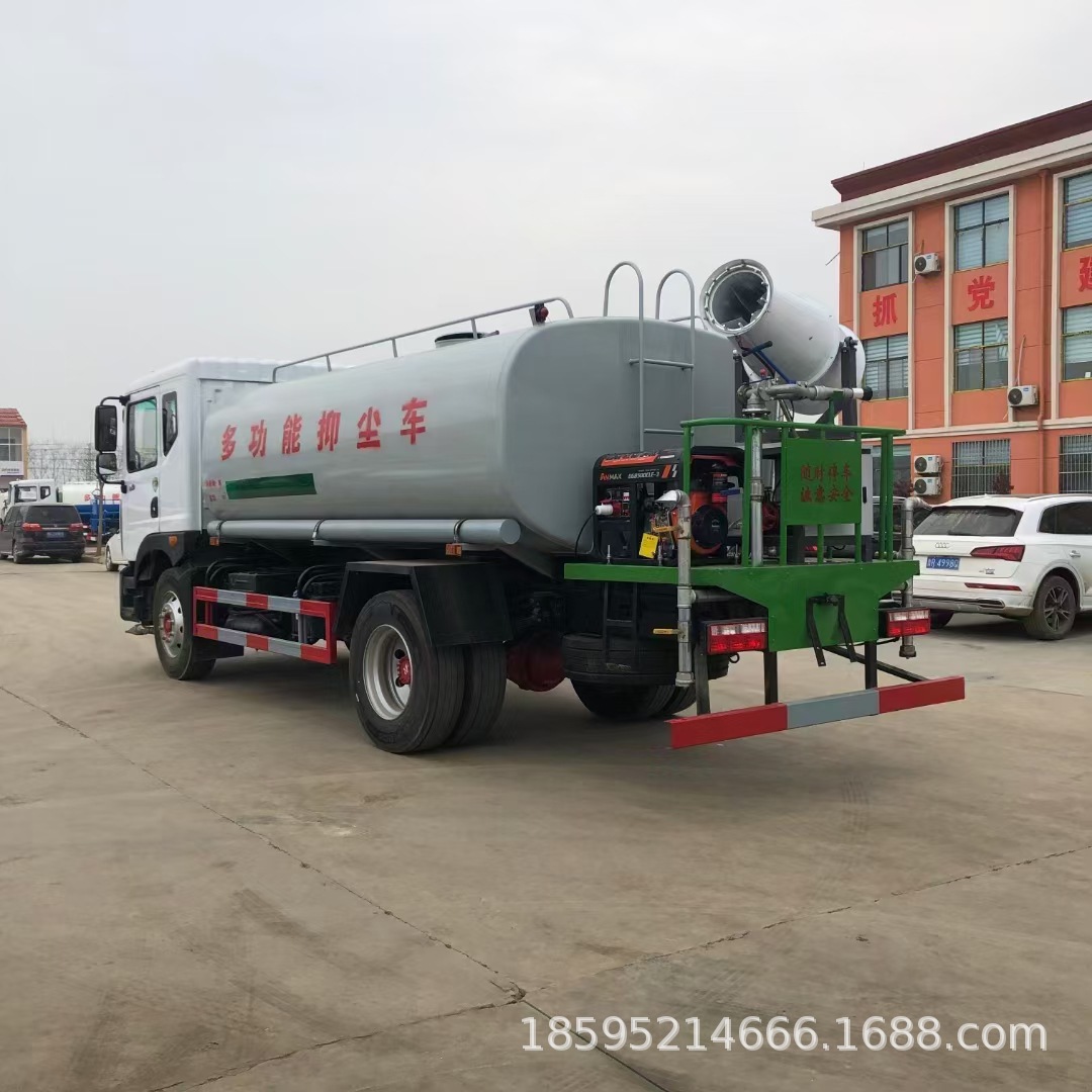 rn上装配置:罐体容积为12-15立方洒水车,罐体钢板为4.75mm碳钢Q235材质,罐内隔板具有防波作用,以减轻汽车行驶时罐体液体冲击,罐体及整车外形尺寸按照公告。带大功率专用洒水泵,泵可自吸自排,整车前冲、后洒、侧喷、带65消防接口,后平台带绿化洒水炮,洒水炮可旋转,可连续调成直冲状、大雨、小雨、毛毛雨;前封头带水位计,后平台主管路带1寸浇花接口,后爬梯。平台后部带小安全告知牌:“随时停车,注意安全”,带两根水管及阴阳端。罐体颜色:上白/下蓝,银灰/银蓝,罐体两侧喷“洒水车、绿化喷洒车”字样,贴反光标示。洒水车可加装前冲后洒气动阀驾驶室控制、可加装雾炮机组发电机组喷雾降尘装置、车头可加装推雪雪铲、雪滚装置街道、公路除雪等。