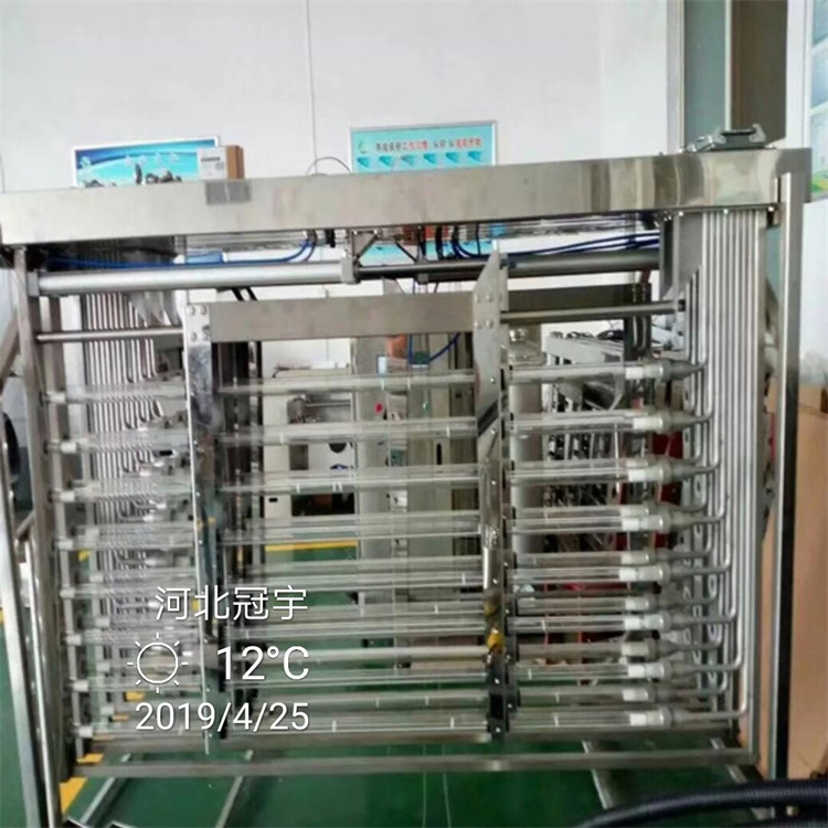 框架(明渠)式紫外消毒器为冠宇公司专利产品,专利号:ZL201120005118.5 该产品是通过布置于明渠内的紫外消毒模块系统,发出辐射波长为253.7nm的短波紫外线,对流经明渠的水体进行杀菌消毒,从而解决处理后的污水细菌指标的超标问题,使最终排放水体的细菌指标达到 并超过国家相关排放标准及水质标准要求的紫外线消毒设备。