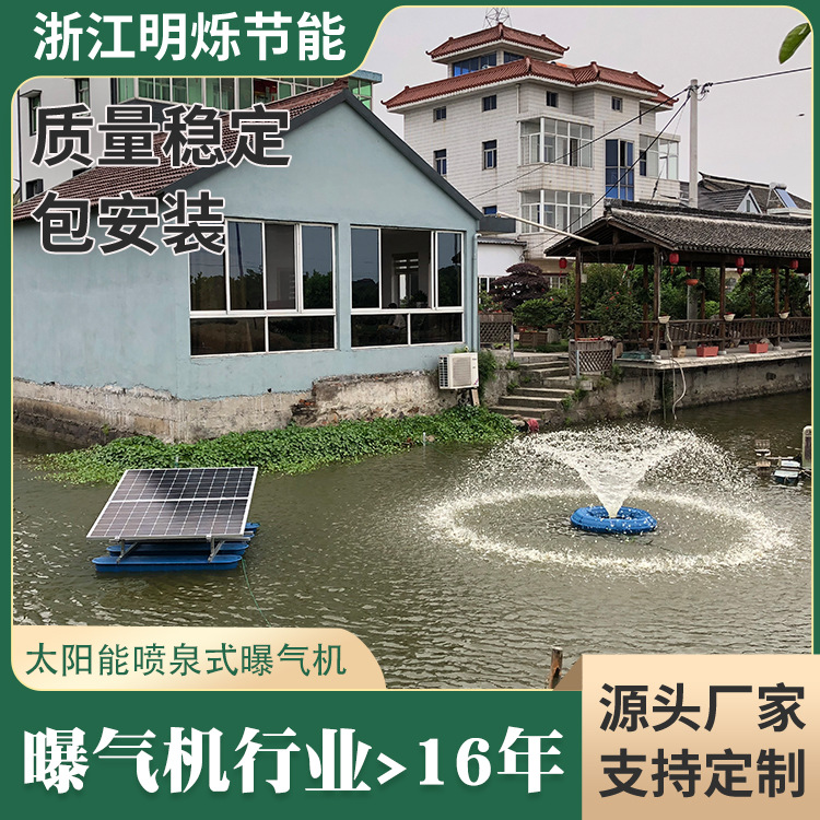 rn明烁太阳能喷泉式曝气机,是利用太阳能供电,驱动直流电机,通过叶轮旋转提升作用形成纵向与横向水流,将表层富氧水体与底层缺氧水体循环交替,达到为水体增氧的目的。主要用于河道、湖泊、水库、人工湖等的太阳能景观增氧系统。太阳能喷泉式增氧系统,解决了普通河道增氧曝气机的供电瓶颈。