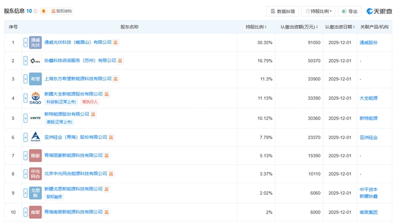 股东信息显示,该公司由10家光伏、多晶硅类企业共同持股,包括通威光伏科技(峨眉山)有限公司、协鑫科技咨询服务(苏州)有限公司、上海东方希望新能源科技有限公司、新疆大全新能源股份有限公司、新特能源股份有限公司、亚洲硅业(青海)股份有限公司、青海丽豪新能源科技有限公司、北京中光同合能源科技有限公司、新疆戈恩斯新能源科技有限公司、青海南玻新能源科技有限公司。