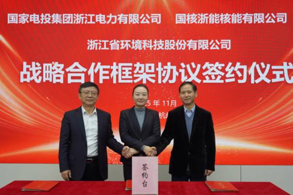2025年11月18日,浙江省环境科技股份有限公司与国家电投集团浙江电力有限公司、国核浙能核能有限公司举行战略合作框架协议签约仪式。三方将围绕环保咨询、环保管理、绿色低碳等领域开展深度合作,共同构建“能源+环保”融合发展新格局,助力绿色能源体系建设迈上新台阶。 签约仪式上,国家电投浙江公司党委委员、副总经理、...