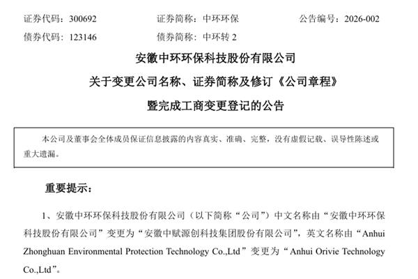 安徽中环环保科技股份有限公司(简称:中环环保)公告称,公司中文名称由“安徽中环环保科技股份有限公司”变更为“安徽中赋源创科技集团股份有限公司”,英文名称由“AnhuiZhonghuan Environmental Protection Technology Co.,Ltd&r...