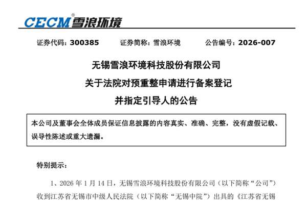 无锡雪浪环境科技股份有限公司(简称:雪浪环境)公告称,公司于2026年1月14日收到江苏省无锡市中级人民法院(以下简称“无锡中院”)送达的《通知书》,无锡中院就申请人对公司的预重整申请进行备案登记。具体内容如下:依照《无锡市中级人民法院预重整工作指引(试行)》之规定,无锡中院同意对公司预重整予以备案登记,并同意...