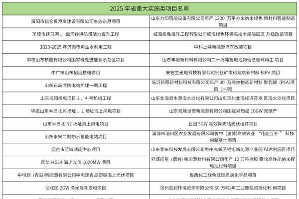 2025年1月10日,山东省人民政府发布《关于下达2025年省重大项目名单的通知》。 重大实施类项目562个,重大准备类项目38个,合计600个项目。其中,涉及节能环保的包括2023-2025 年济南市再生水利用工程,烟台市区域储能中心项目,沾化区 2GW 渔光互补发电项目,三一重能五莲县 45 万千瓦风电项目,博山氢能产业园项目,...