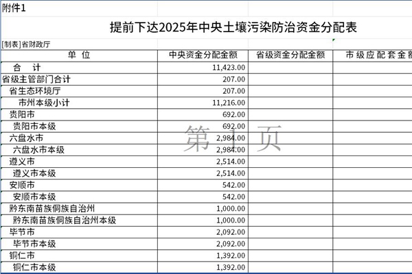 省财政厅关于提前下达2025年中央土壤污染防治资金预算的通知黔财资环〔2024〕117号 省生态环境厅,有关市(州)财政局: 根据《财政部关于提前下达2025年土壤污染防治资金预算的通知》(财资环〔2024〕130号),现提前下达2025年中央土壤污染防治资金预算11423万元,并将有关事项通知如下: 一、省本级请将该项资金支出列入...