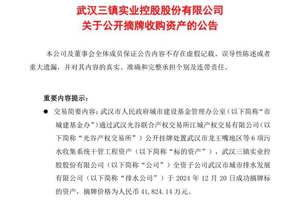 近日,武汉控股发布公开摘牌收购资产的公告。公告显示,武汉市人民政府城市建设基金管理办公室(以下简称“武汉市城建基金办”)通过武汉光谷联合产权交易所江城产权交易有限公司(以下简称“光谷产权交易所”)公开挂牌处置武汉市龙王嘴地区等 6 项污水收集系统干管工程资产(以下简称“标的资...