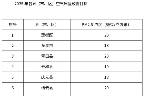 丽水市人民政府关于印发丽水市空气质量持续改善行动计划的通知 各县(市、区)人民政府,市政府直属各单位: 现将《丽水市空气质量持续改善行动计划》印发给你们,请认真组织实施。 《丽水市空气质量持续改善行动计划工作任务清单》由市生态文明委办公室另行印发。 丽水市人民政府 2024年11月15日 (此件公开发布)丽水市空气质量持续改善...