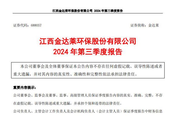 江西金达莱环保股份有限公司(简称:金达莱)近日发布《2024 年第三季度报告》,前三季度共实现营业收入3.08亿元,同比减少16.75%;归属于上市公司股东的净利润1.08亿元,同比增加0.26%;基本每股收益0.3914元。图源:金达莱公告 资料显示,金达莱长期专注于解决生活污水、工业废水处理 的痛点、难点,立足自主创新,先后攻克...