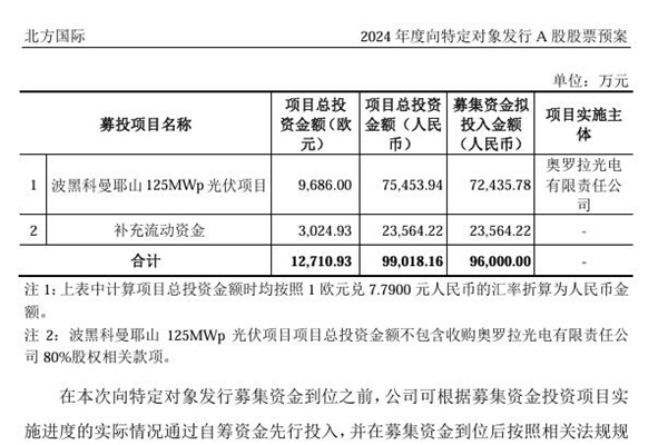 2024年11月1日,北方国际合作股份有限公司发布《2024年度向特定对象发行A股股票预案》。图源:北方国际合作股份有限公司公告 预案明确,本次向特定对象发行A股股票的发行对象为不超过35名特定投资者(含本数),本次向特定对象发行股票数量不超过105,960,264股(含本数),且未超过本次向特定对象发行前公司总股本的30%。 预...