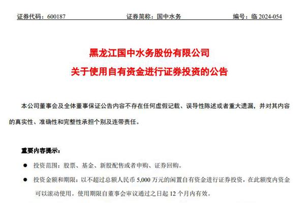 10月8日,国中水务发布公告,公司拟使用最高额度不超过人民币5000万元的闲置自有资金进行证券投资。 对于投资目的,公告指出,在保证公司正常经营所需流动资金和有效控制风险的前提下,为提高资金使用效率,降低财务成本,创造更大的经济效益。 资金来源方面,公告指出,本次证券投资事项使用的资金仅限于公司的自有资金,在确保公司生产经营正常运...