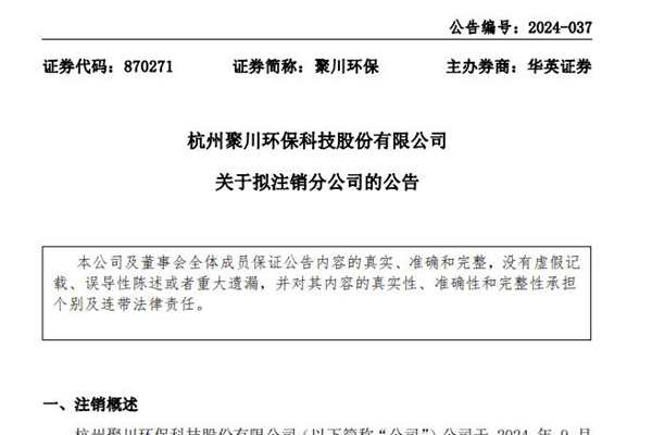 新三板上市公司杭州聚川环保科技股份有限公司(简称:聚川环保)发布公告,拟注销洛阳分公司。据介绍,聚川环保洛阳分公司成立于2022年,经营范围涉及生活垃圾处理装备销售、气体压缩机械销售、工业自动控制系统装置销售、污水处理及其再生利用、环境卫生公共设施安装服务、水环境污染防治服务等等。 聚川环保表示,此次注销洛阳分公司目的是优化公司治理...