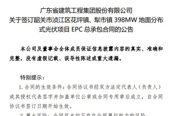 2024年9月26日,广东省建筑工程集团股份有限公司发布《关于签订韶关市浈江区花坪镇、犁市镇 398MW 地面分布式光伏项目 EPC 总承包合同的公告》。图源:广东省建筑工程集团股份有限公司公告 公告显示,广东建工已签订韶关市浈江区花坪镇、犁市镇 398MW 地面分布式光伏项目的20个子项目的EPC 总承包合同,剩余 4 个项目 E...