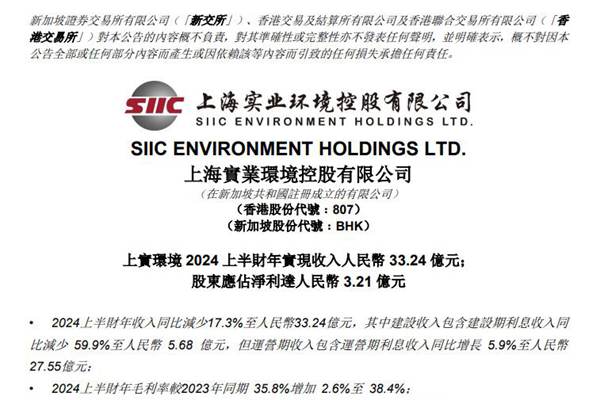 近日,上海实业环境发布截至2024年6月30日前6个月业绩,该集团期内取得收入33.24亿元(人民币,下同),同比减少17.3%;股东应占溢利3.21亿元,同比减少14.8%。公司指,因需要资金为资本开支及项目投资提供资金支持,故不派息。此外,于截至2024年6月30日止3个月,该集团期内取得收入16.95亿元,同比减少19.3%;股...