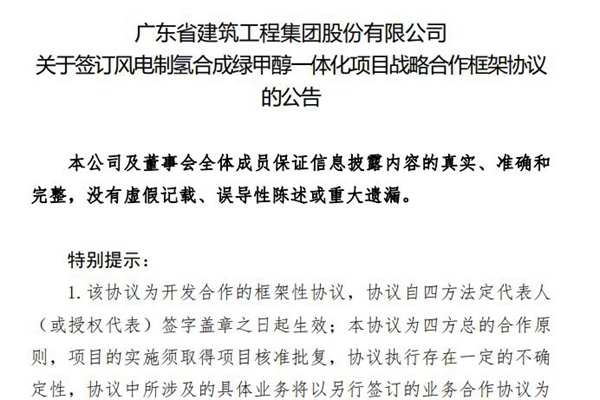 2024年8月9日,广东省建筑工程集团股份有限公司发布《关于签订风电制氢合成绿甲醇一体化项目战略合作框架协议的公告》。 特别提示: 1.该协议为开发合作的框架性协议,协议自四方法定代表人(或授权代表)签字盖章之日起生效;本协议为四方总的合作原则,项目的实施须取得项目核准批复,协议执行存在一定的不确定性,协议中所涉及的具体业务将以另...