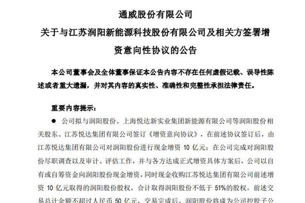 2024年8月14日,通威股份有限公司发布《关于与江苏润阳新能源科技股份有限公司及相关方签署增资意向性协议的公告》。 概括一下,第一步,江苏悦达集团对润阳新能源进行现金增资 10 亿元;第二步,通威股份向润阳新能源现金增资,同时收购江苏悦达集团前述获得的股权,最终结果是,通威股份获得润阳新能源不低于51%的股权,并且交易金额不超过5...