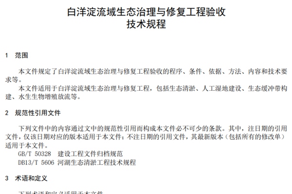 2024年2月2日,河北省地方标准《白洋淀流域生态治理与修复工程验收技术规程》(DB 13/T 5917—2024)发布,并已于2024年3月2日启动施行。本文件由河北省生态环境厅提出并归口,起草单位主要有河北省生态环境科学研究院、河北省水利科学研究院。 本文件规定了白洋淀流域生态治理与修复工程验收的程序、条件、依据、方...