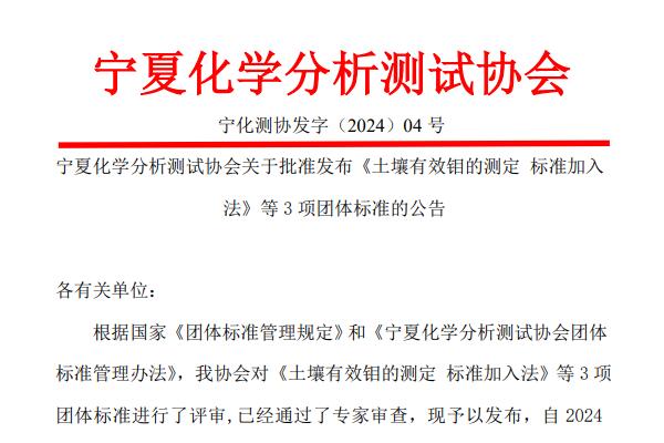 宁夏化学分析测试协会关于批准发布《土壤有效钼的测定 标准加入法》等3项团体标准的公告 各有关单位: 根据国家《团体标准管理规定》和《宁夏化学分析测试协会团体标准管理办法》,我协会对《土壤有效钼的测定 标准加入法》等3项团体标准进行了评审,已经通过了专家审查,现予以发布,自2024年1月31日起正式实施,特此公告。宁夏化学分析测试协会 ...