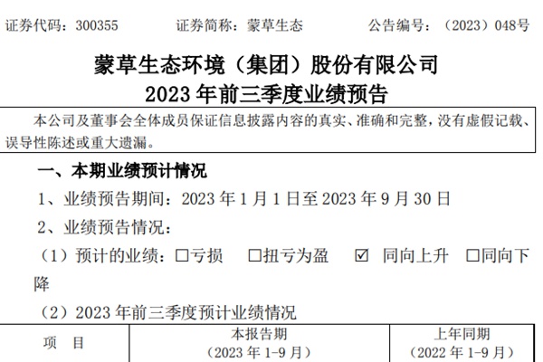 主营生态修复、环境治理和种业科技的蒙草生态环境(集团)股份有限公司(简称“蒙草生态”)近日公开《2023年前三季度业绩预告》。 蒙草生态预计,2023年前三季度预计业绩同向上升,归属于上市公司股东的净利润达25828.12万元-30386.02万元,比上年同期15193.01万元增长70%-100%;归属于上...