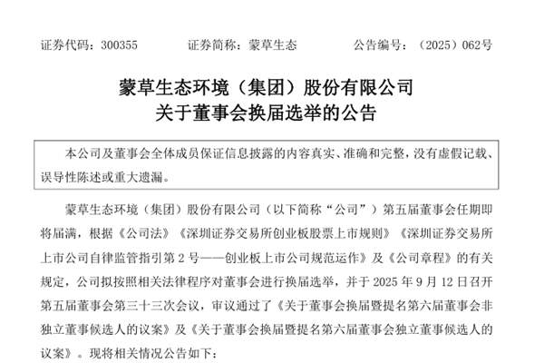 蒙草生态环境(集团)股份有限公司(简称:蒙草生态)近日公告称,公司于2025年9月12日召开第五届董事会第三十三次会议,审议通过了《关于董事会换届暨提名第六届董事会非独立董事候选人的议案》及《关于董事会换届暨提名第六届董事会独立董事候选人的议案》: 公司第六届董事会由9名董事组成,其中非独立董事5名,职工代表董事1名,独立董事3名。...