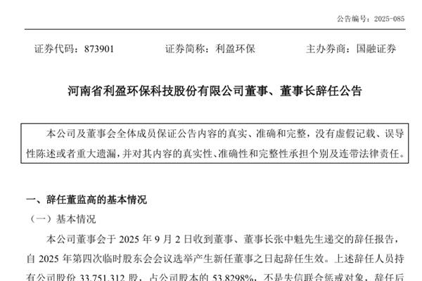 河南省利盈环保科技股份有限公司(简称:利盈环保)近日公告称,公司已收到董事、董事长张中魁先生递交的辞任报告,自2025年第四次临时股东会会议选举产生新任董事之日起辞任生效。上述辞任人员持有公司股份33,751,312 股,占公司股本的 53.8298%,不是失信联合惩戒对象,辞任后不再担任公司其它职务。 本次辞任导致利盈环保董事会成...