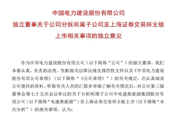 8月24日,中国电建发布《独立董事关于公司分拆所属子公司至上海证券交易所主板上市相关事项的独立意见》,计划分拆所属子公司中电建新能源集团股份有限公司(简称“电建新能源”)至上海证券交易所主板上市。电建新能源将在获取上交所批准及中国证监会同意注册后择机发行。 本次分拆完成后,中国电建将继续立足大基建,聚焦&ld...