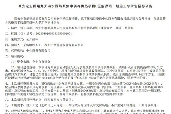 《西安宏府鹍翔九天污水源热泵集中供冷供热项目E区能源站一期施工总承包招标公告》发布,招标人(采购组织人)西安中节能建筑能源有限公司。 项目建设规模:本项目为西安宏府•鹍翔九天污水源热泵集中供冷供热项目。该项目设计总供能面积108万平方 米。供能区域分为A、B、C、D、E五个区,项目在D区和E区分别建设能源站。其中D区能源中...