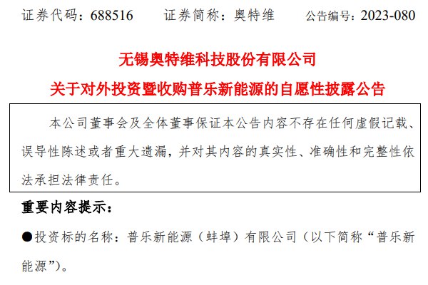 8月16日晚间,无锡奥特维科技股份有限公司(简称:奥特维)发布公告称,为进一步提升公司竞争力,拓宽公司在光伏领域核心环节的产品种类,实现公司在光伏设备各产业链核心环节的产品布局,拟以现金2.7亿元收购普乐新能源(蚌埠)有限公司(下称:普乐新能源)100%股权。 据介绍,奥特维主要从事光伏、锂电及半导体高端智能装备的研发、设计、生产和...