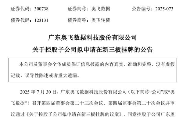 7月30日,广东奥飞数据科技股份有限公司(简称:奥飞数据)公告称,已同意控股子公司广东奥飞新能源股份有限公司(下称“奥飞新能源”)拟申请在全国中小企业股份转让系统(下称“新三板”)公开转让并挂牌事宜,并授权公司及奥飞新能源管理层具体办理奥飞新能源新三板挂牌相关事宜。该议案无须提交公司股东...